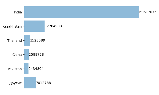 (인도가 압도적 1위, 카자흐스탄 2위, 태국 3위, 중국 4위, 파키스탄 5위 등)